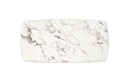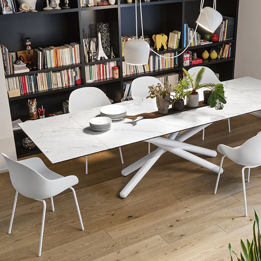Table Duel de Connubia CB4850 extensible avec deux rallonges latérales s'ouvrant individuellement, plateau rectangulaire en céramique. La structure et les pieds périphériques sont en métal, disponibles en différentes finitions.