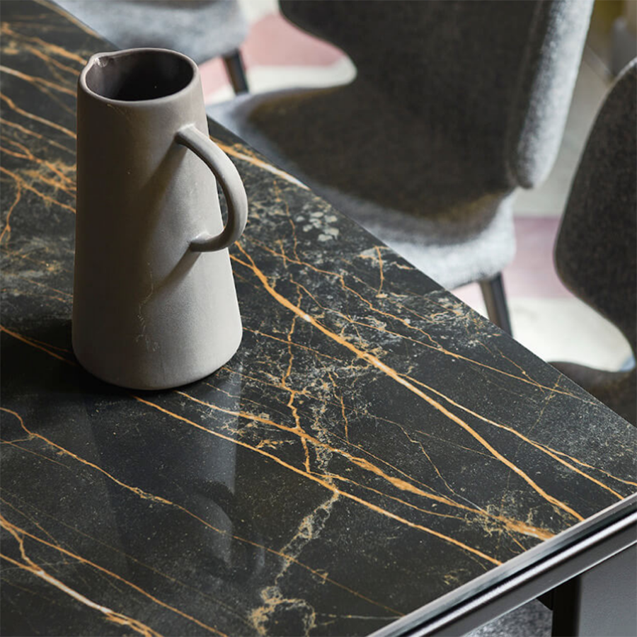 Plateau et rallonges en verre, cristal-céramique ou plaqué frêne, chêne ou noyer.