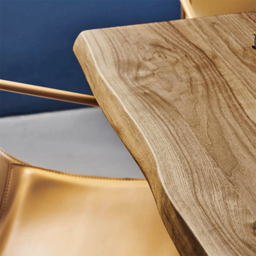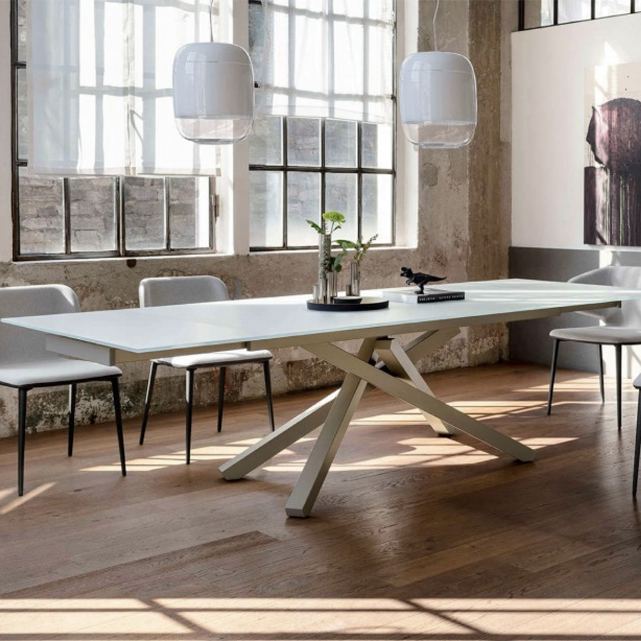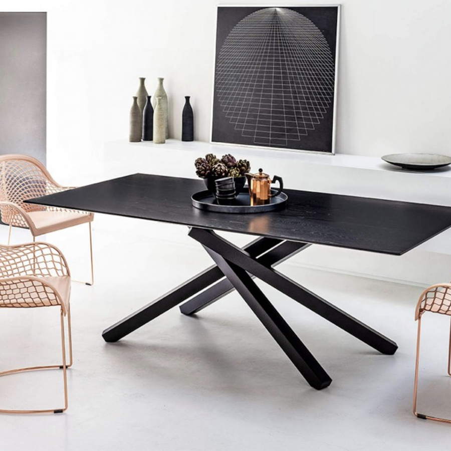 Table fixe Beijing avec base en métal et plateau en verre, bois plaqué ou bois massif. Existe aussi en version extensible.
