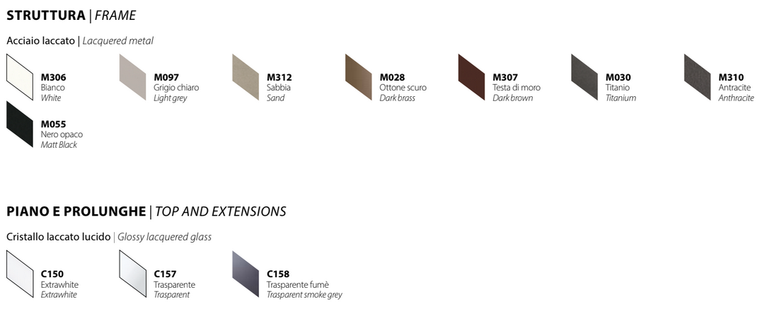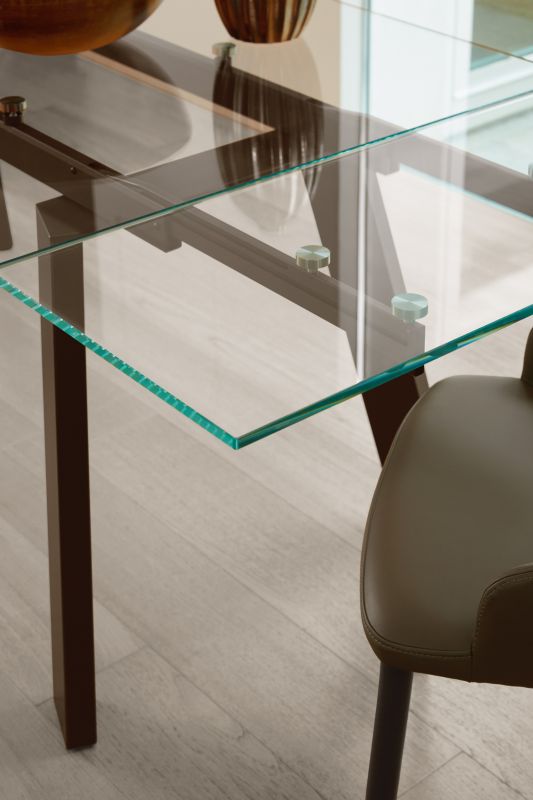 Table Gulliver d'Ingenia Bontempi extensible. Structure à 4 pieds entièrement en acier laqué dans différentes finitions possibles. Splendide plateau en cristal avec extensions également en cristal en trois couleurs : Extraclear Transparent, Smoked Transparent et ExtraWhite Transparent. Une table élégante et design qui avec ses lignes modernes meublera parfaitement votre salle à manger ou votre cuisine.