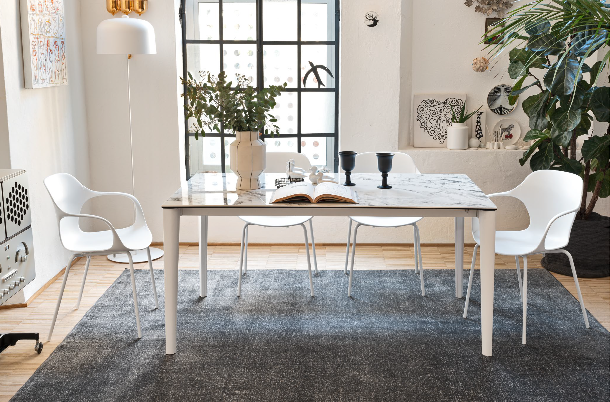Table Artic CB4855-R avec plateau en mélamine (avec rallonges en mélamine) ou plateau en céramique (avec rallonges en mélamine) et piètement en métal. Disponible en plusieurs tailles, avec une ou plusieurs rallonges, la table Artic s'adapte à tous les espaces et styles. Elle est extensible grâce à un mécanisme manuel : les rallonges se relèvent et se positionnent à la hauteur du plateau principal, tandis que les pieds restent toujours sur le périmètre.