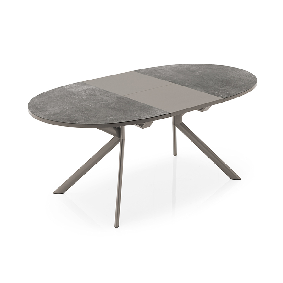Base centrale fixe en métal avec quatre pieds à section elliptique inclinée et mécanisme d'ouverture de type livre avec rallonge centrale de la même couleur que la base.