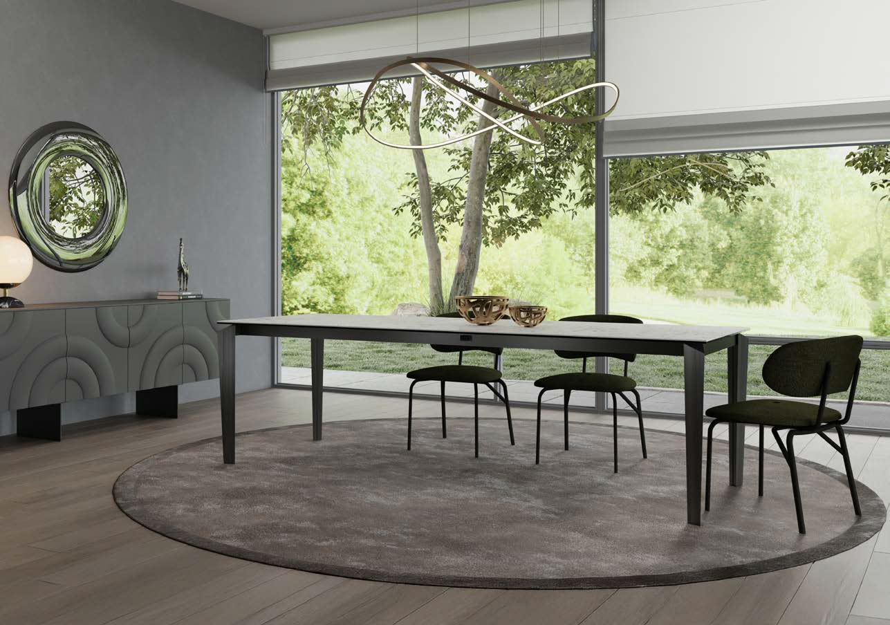 Table extensible ou fixe avec guide en aluminium à ouverture télescopique brevetée, avec pont de pieds en métal peint en différentes finitions avec plateau extensible en différents matériaux et finitions.
