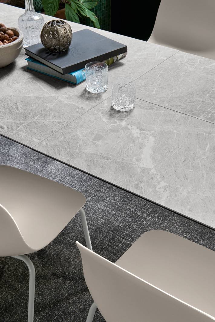 Table Eminence Evo Fast CB4859-R avec plateau en céramique, rallonge latérale en céramique et piètement en métal. Ce modèle se distingue par son pied elliptique. Disponible en deux tailles, la table Eminence Evo Fast s'adapte à tous les espaces et styles. Elle est extensible grâce à un mécanisme semi-automatique ; les rallonges se positionnent facilement grâce à des glissières spéciales. Les pieds sont toujours périphériques pour un confort optimal.