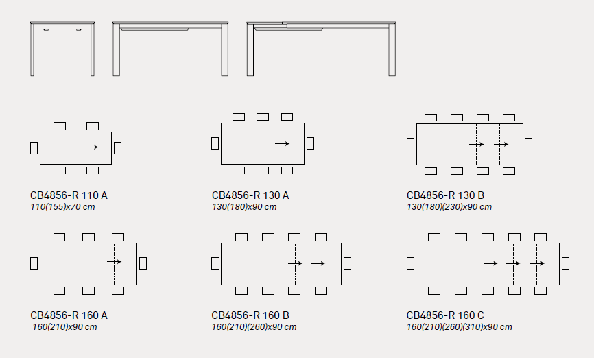 • CB4856-R 160 B cm : L. 160 extensible à 210 et 260 x P. 90 x H. 76 (66,5)