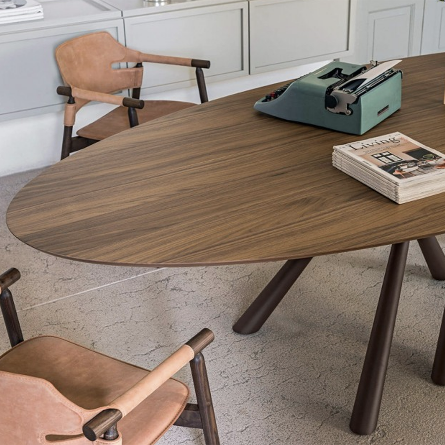 Table elliptique fixe Forest avec pieds en métal peint. Le plateau est disponible en bois plaqué ou en cristal céramique dans de nombreuses variantes avec une finition brillante.