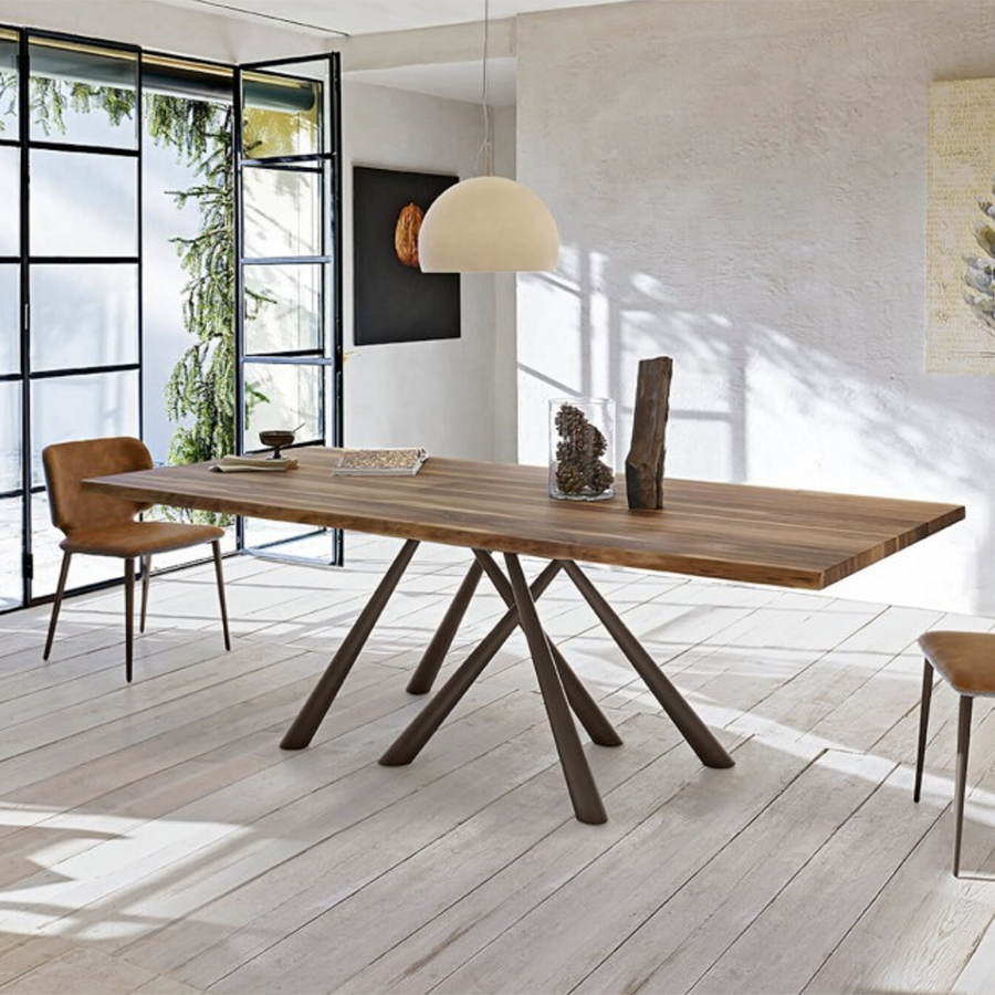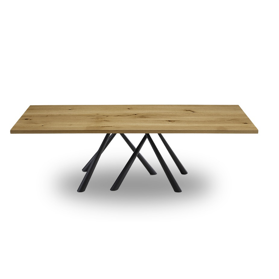 Table Forest fixe avec base en métal peint, disponible en deux tailles. Plateau en noyer ou chêne massif.