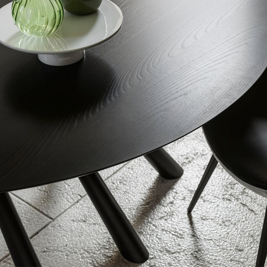 Table Forest fixe Ø150 avec piètement en métal peint. Plateau en placage bois ou cristal céramique.