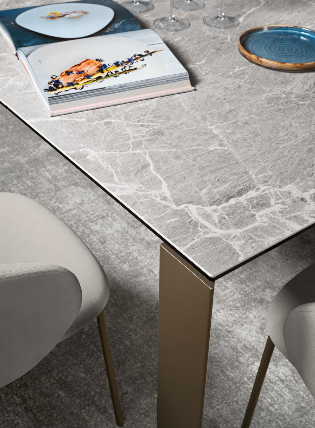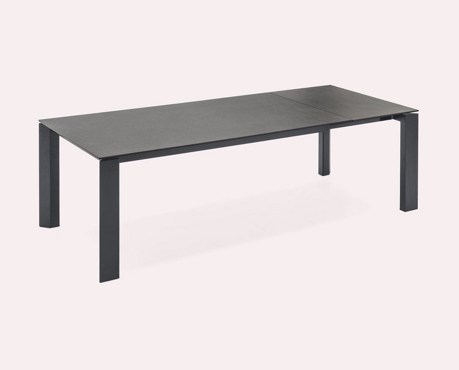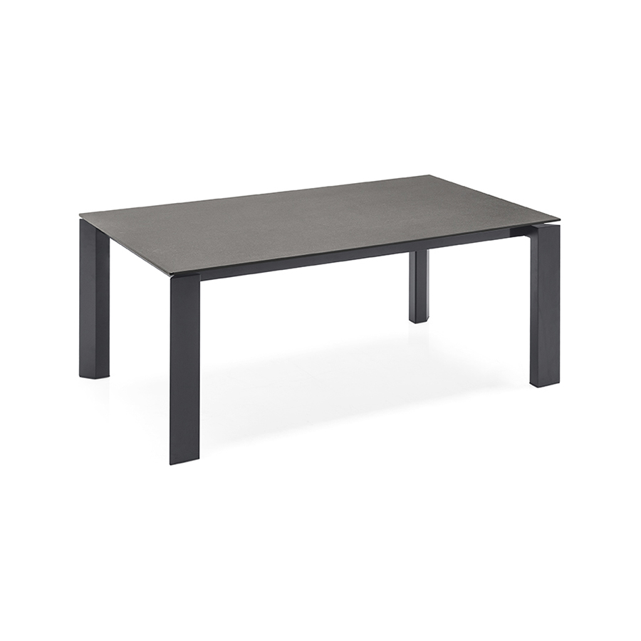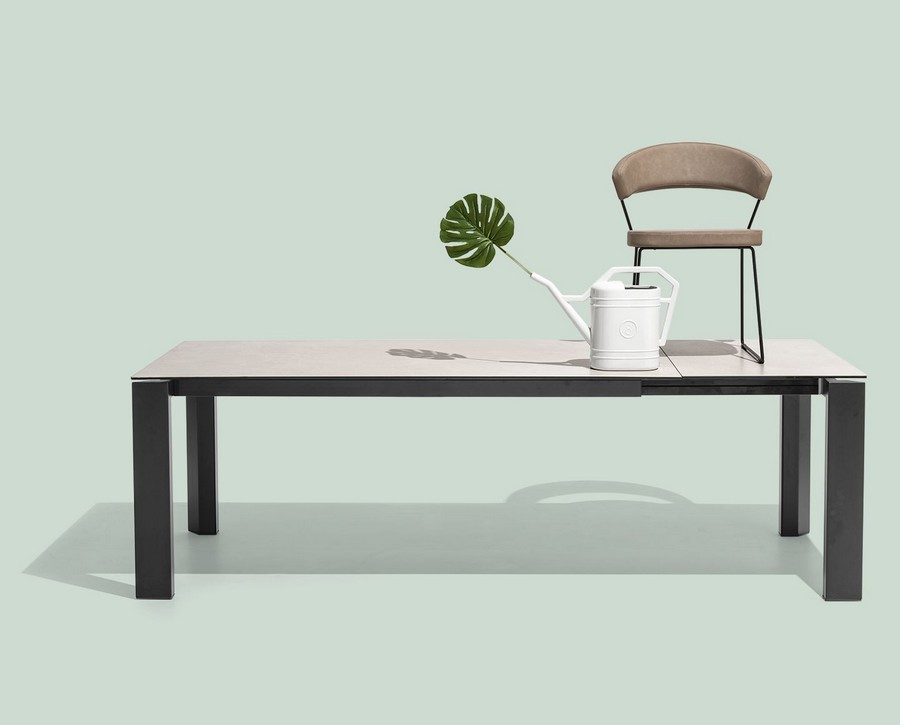 GATE est une table à la personnalité affirmée : base en métal et plateau en céramique. Extrêmement pratique, elle est extensible grâce à un mécanisme simple intégré à la structure, s'adaptant à tous les besoins.