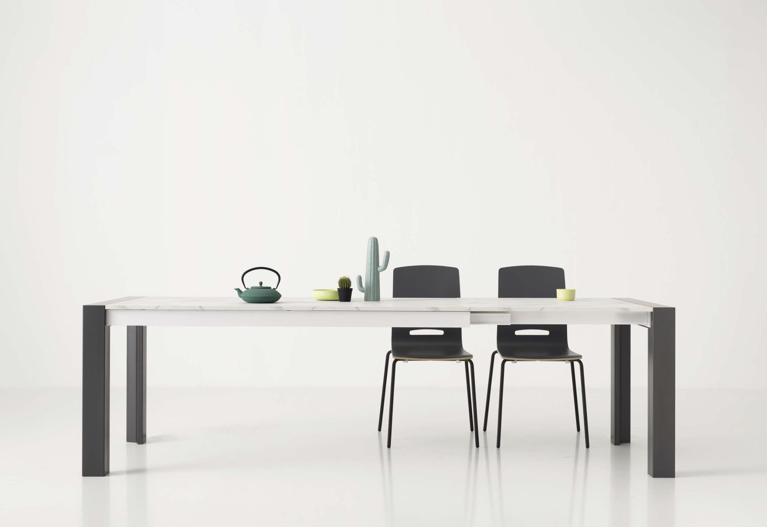 Milano de Point House est une table à deux rallonges de 40 cm (ou trois dans la version LONGUE), dotée d'un mécanisme d'ouverture périphérique monté sur des glissières en aluminium. La structure métallique est laquée époxy ou plaquée effet bois. La table Milano se distingue par ses pieds, disponibles en mélamine ou en MDF laqué, équipés du système breveté de roulettes rétractables « Click Clak », qui facilite l'ouverture de la table. Le plateau en mélamine a une épaisseur de 18 mm.