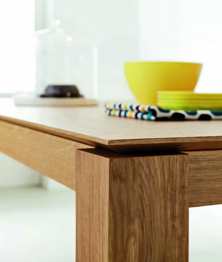 Version chêne : Structure en chêne massif, pieds 120×120 mm, plateau épaisseur 25 mm en contreplaqué ou latté avec panneau en chêne et équarrissage périmétrique en chêne européen massif. Surface rabotée. Colles vinyliques à l'eau, peintures acryliques bi-composantes. Guides télescopiques en alliage d'aluminium montés sur roulements à billes.