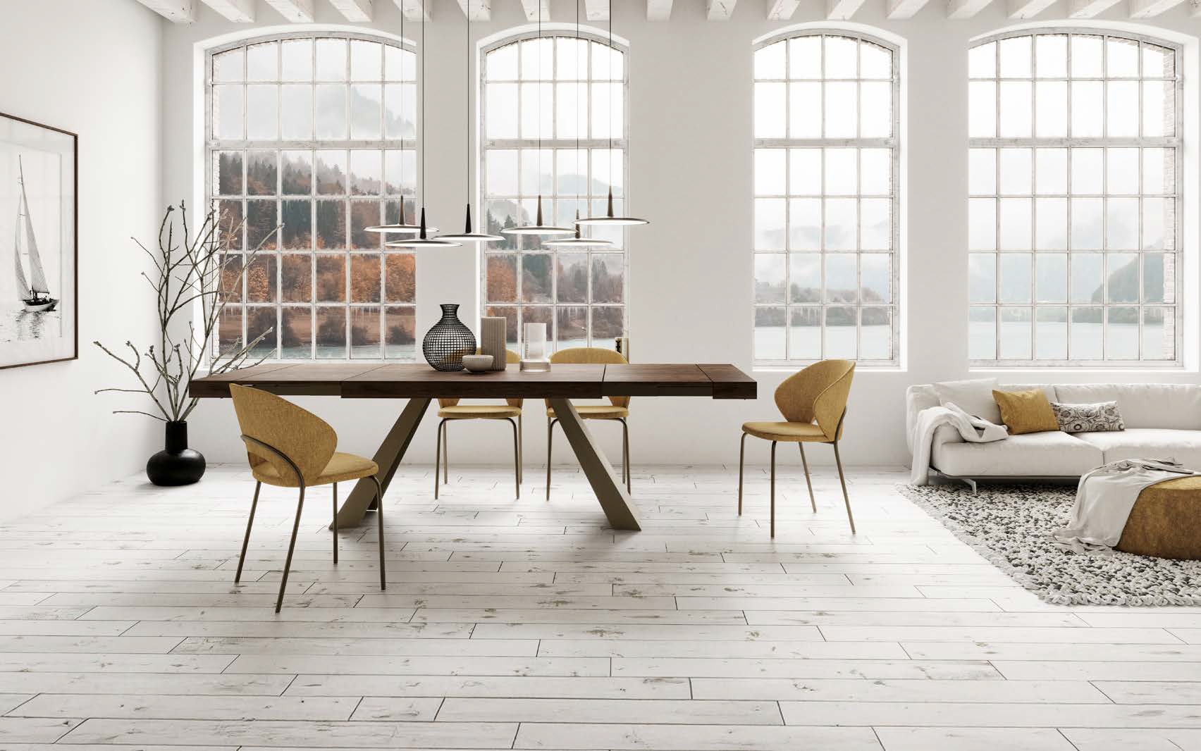 Table extensible avec base en métal peint en différentes finitions et plateau et rallonges en différents matériaux et finitions.