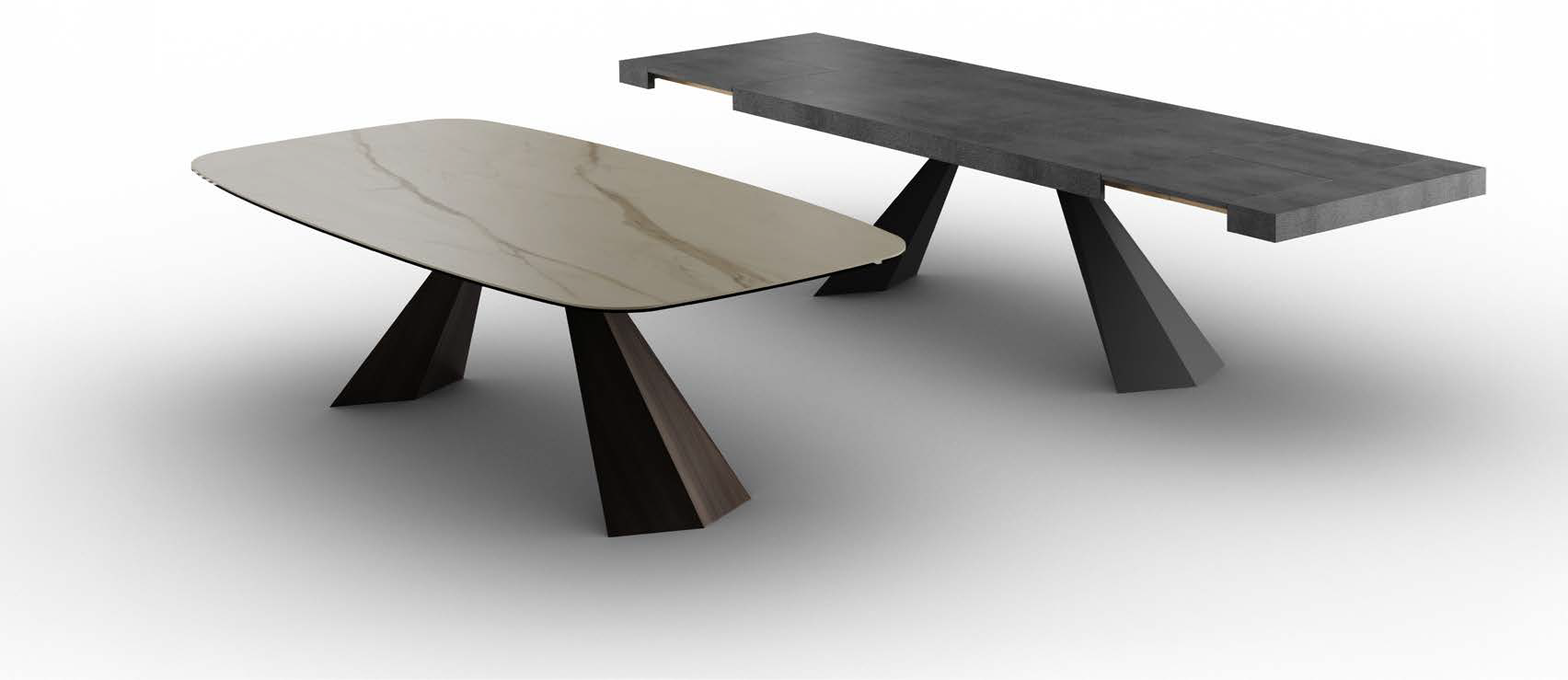 Table fixe avec base en métal peint en différentes finitions et plateau et rallonges en différents matériaux et finitions.