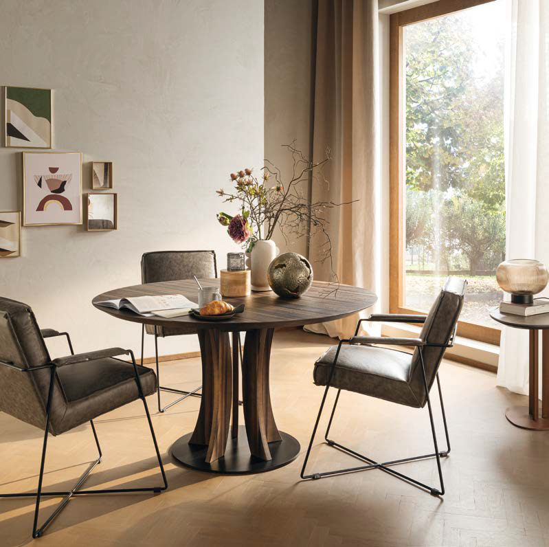 Table ronde fixe Luna d'Altacorte avec plateau et structure en chêne ou noyer, tandis que la base (plaque) est en acier. La table Luna s'inspire des phases de la lune à travers la courbure des pieds. La lumière traversant les formes du bois crée des jeux d’ombres toujours changeants.