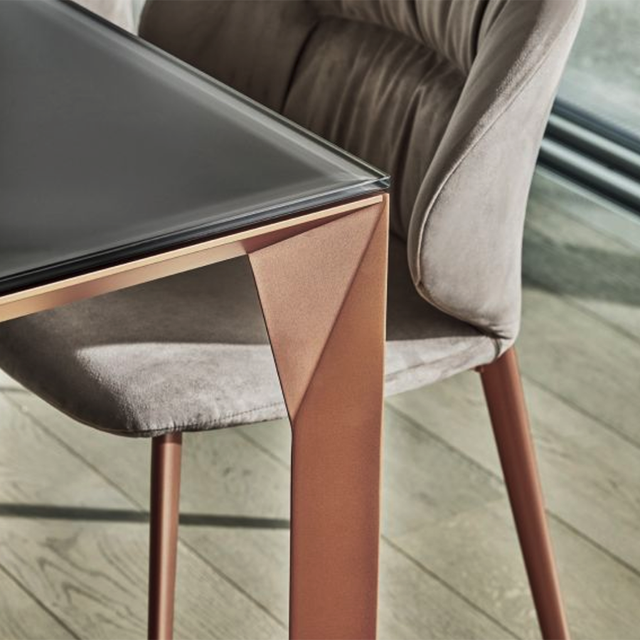 Table Mirage carrée ou rectangulaire fixe de Bontempi. Les pieds de la table Mirage se caractérisent par leurs facettes taillées en diamant, lui conférant une allure légère et élégante et s'alliant parfaitement à la stabilité et à la robustesse de l'aluminium, ce qui en fait une pièce unique.