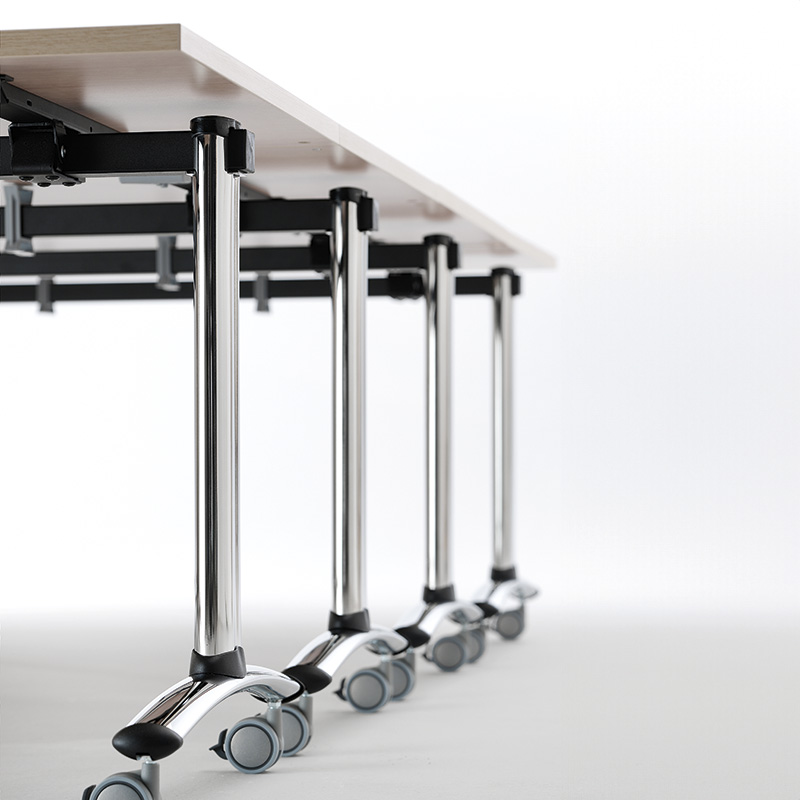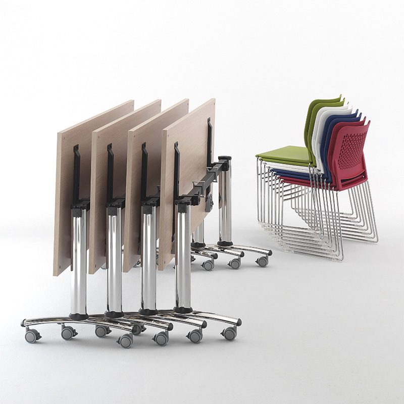 Table avec plateau rabattable verticalement et empilable horizontalement. Pied en tube d'acier ovale 90 x 30 mm, finition chromée. Carter et embouts en nylon noir. Poutre en acier carré 40 x 40 mm, revêtement époxy noir. Mécanisme de pliage en acier embouti avec poignée de déverrouillage en nylon. Roulettes de 65 mm de diamètre avec frein à pied. Plateau mélaminé avec chant ABS, épaisseur 25 mm, dimensions 1400 x 700 mm, disponible en chêne blanchi et blanc.