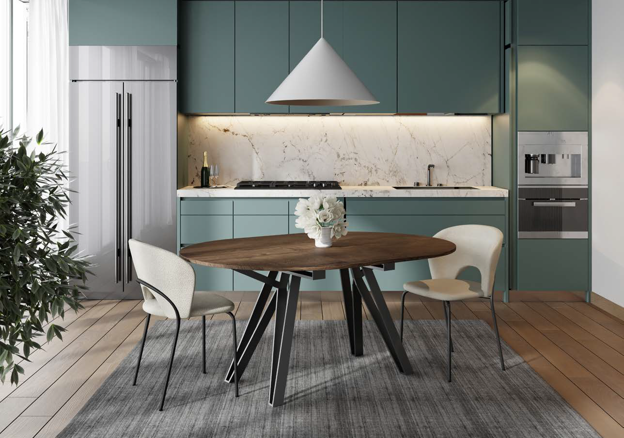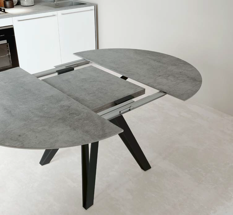 Table extensible ronde ou carrée avec guide en aluminium à ouverture centrale. Structure en métal peint et plateaux en céramique ou mélamine en différentes finitions, avec rallonge centrale et ouverture en forme de livre en mélamine de la même couleur que les plateaux en mélamine et en stratifié avec plateaux en céramique.