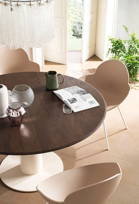 La table Orby avec sa forme circulaire est la reproduction parfaite de l'ensemble et sa conformation exprime plénitude et harmonie pour tous ceux qui aiment partager à table. Cette perspective s'accentue à mesure que la table s'allonge, prenant une forme elliptique.