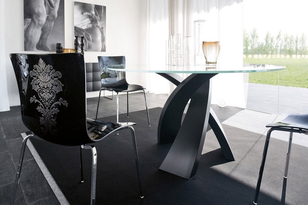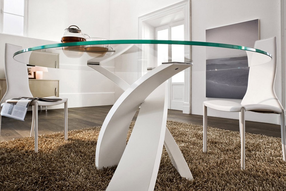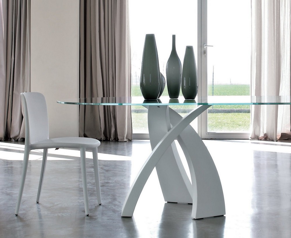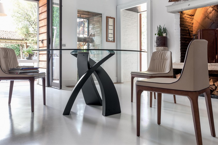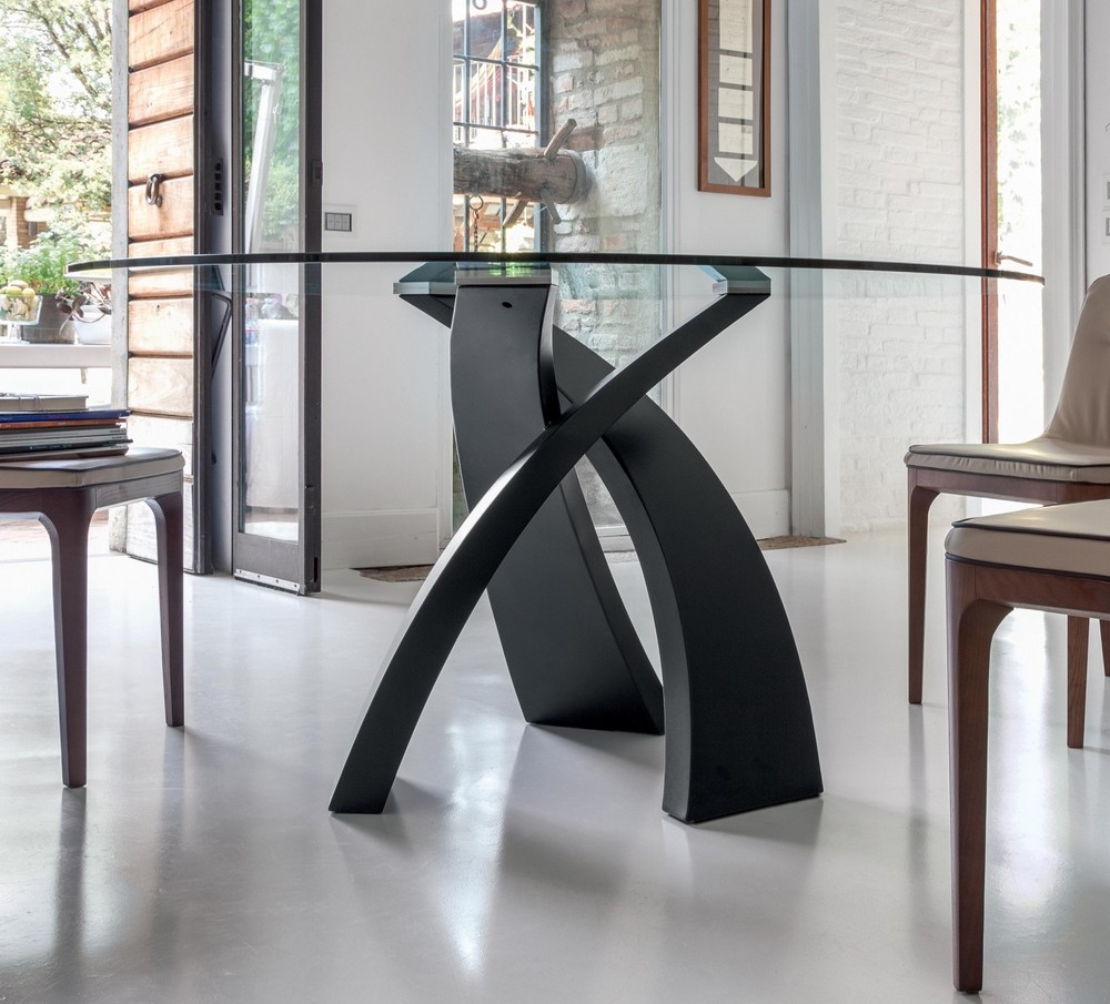 Table fixe Eliseo de Tonin Casa avec piètement à trois pieds qui se croisent en métal laqué, le plateau est en verre, bois ou grès disponible en plusieurs dimensions. Un plateau en bois de différentes essences, ou en verre trempé électrosoudé aux rayons UV sur une plaque d'acier; le tout reposant sur une base métallique courbée et peinte, pour obtenir un effet de grand raffinement esthétique. Avec Eliseo, une table à manger extrêmement raffinée est née, également disponible en version tricolore et à double base, capable de s'adapter à des pièces de différentes tailles.