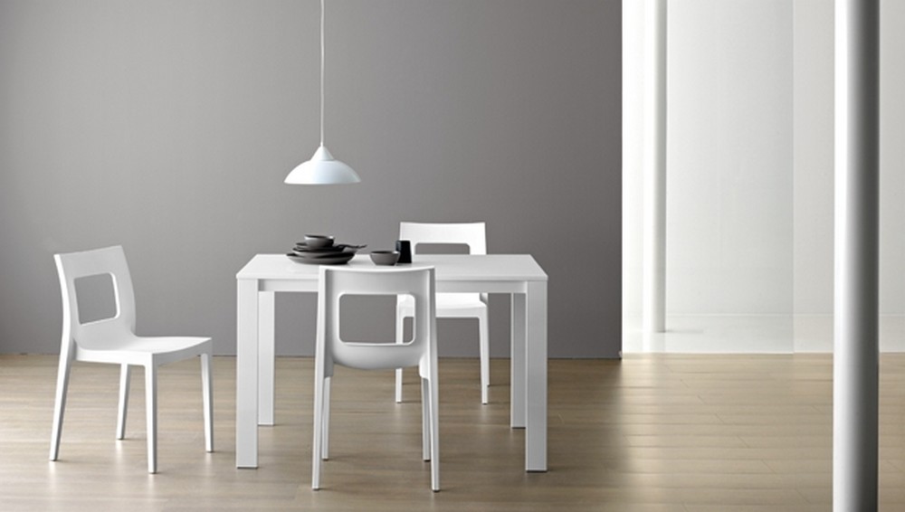Table simple de Point House avec structure télescopique en métal thermolaqué époxy. Pieds en pont. Le plateau de 18 mm d'épaisseur est disponible en mélamine, Cleaf ou verre. Les rallonges sont disponibles en mélamine ou en stratifié.