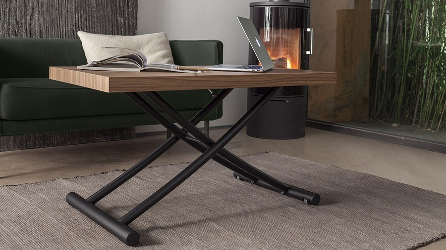 Table basse transformable en table à manger Geniale par Altacom. Piètement en métal, mécanisme à gaz, hauteur réglable au millimètre près de 11 cm à 75,5 cm, plateau rectangulaire en mélaminé. Roulettes escamotables et roulettes transversales.