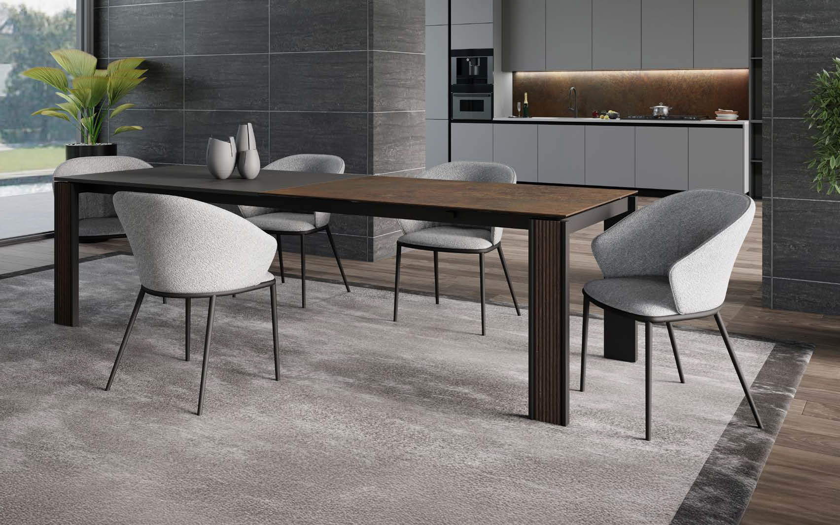 Table fixe ou extensible avec guide en aluminium à ouverture télescopique brevetée, base en métal peint en différentes finitions et insert cannelé, avec plateau et rallonges en différents matériaux et finitions.