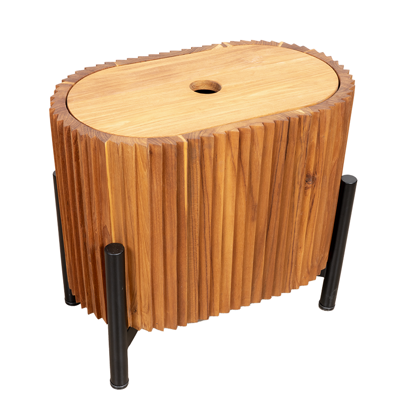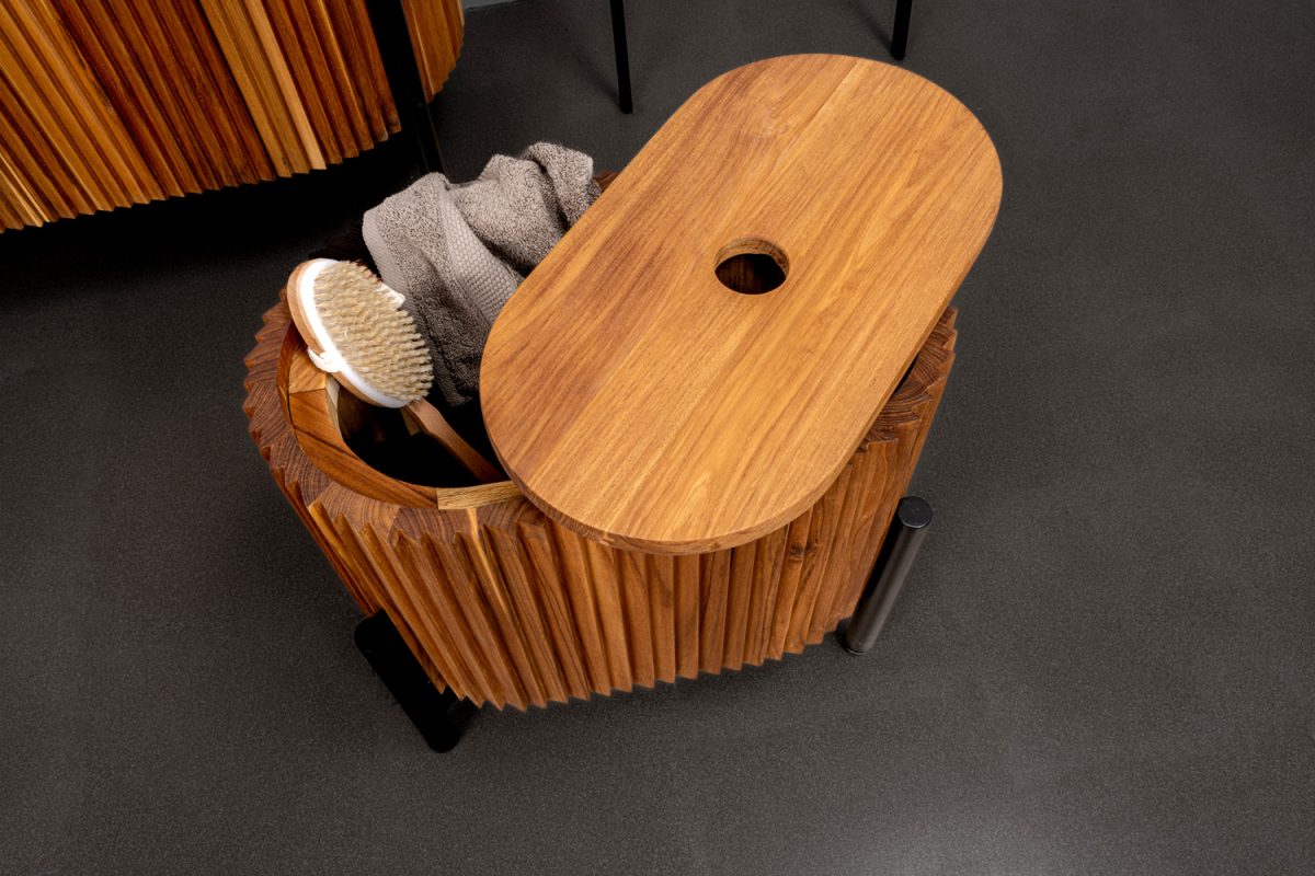 Uniquement du teck massif extra sec pour garantir des performances maximales. Fonctionnel et très stylé ! Un tabouret confortable cache un grand espace de rangement parfait pour ranger les éponges, les sèche-cheveux et lisseurs, les produits d'entretien ou tout simplement le linge sale. Tout est en ordre et tout est en place rapidement, ou plutôt Vite !