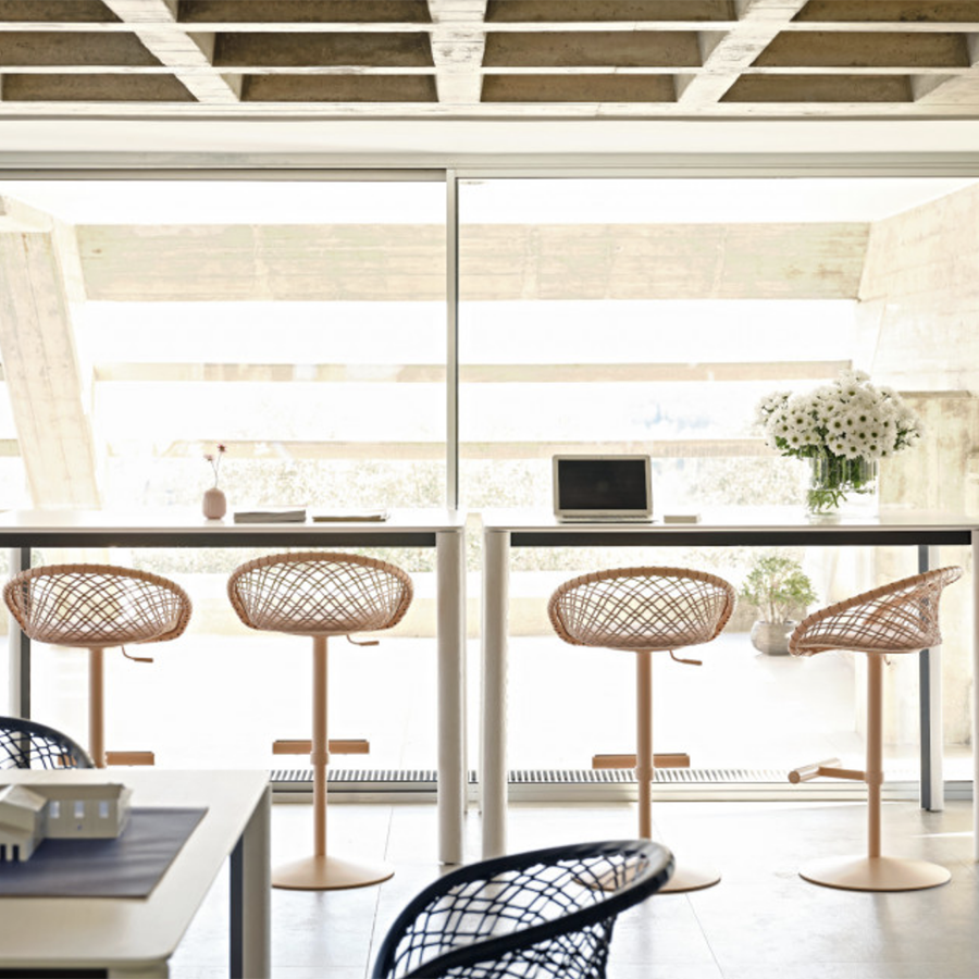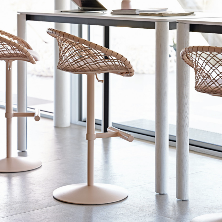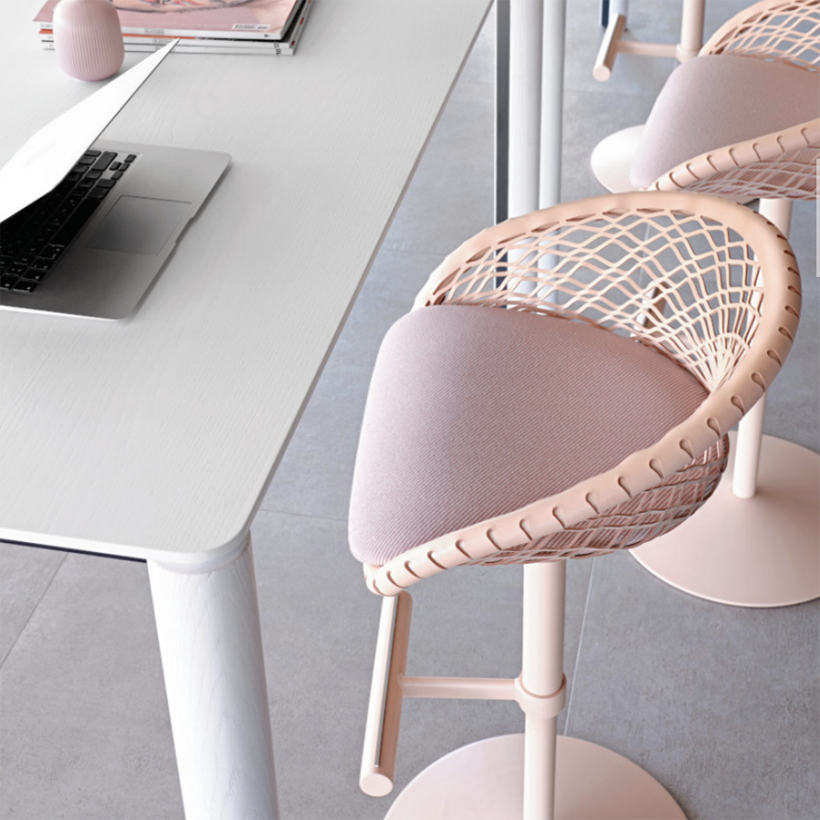 Les espaces de travail s'enrichissent de style et d'élégance lorsque le tabouret P47 s'intègre dans le mobilier. Il est fonctionnel, équipé d'une hauteur réglable et d'un repose-pieds, et polyvalent grâce à la base unicolore qui permet des combinaisons de couleurs originales.