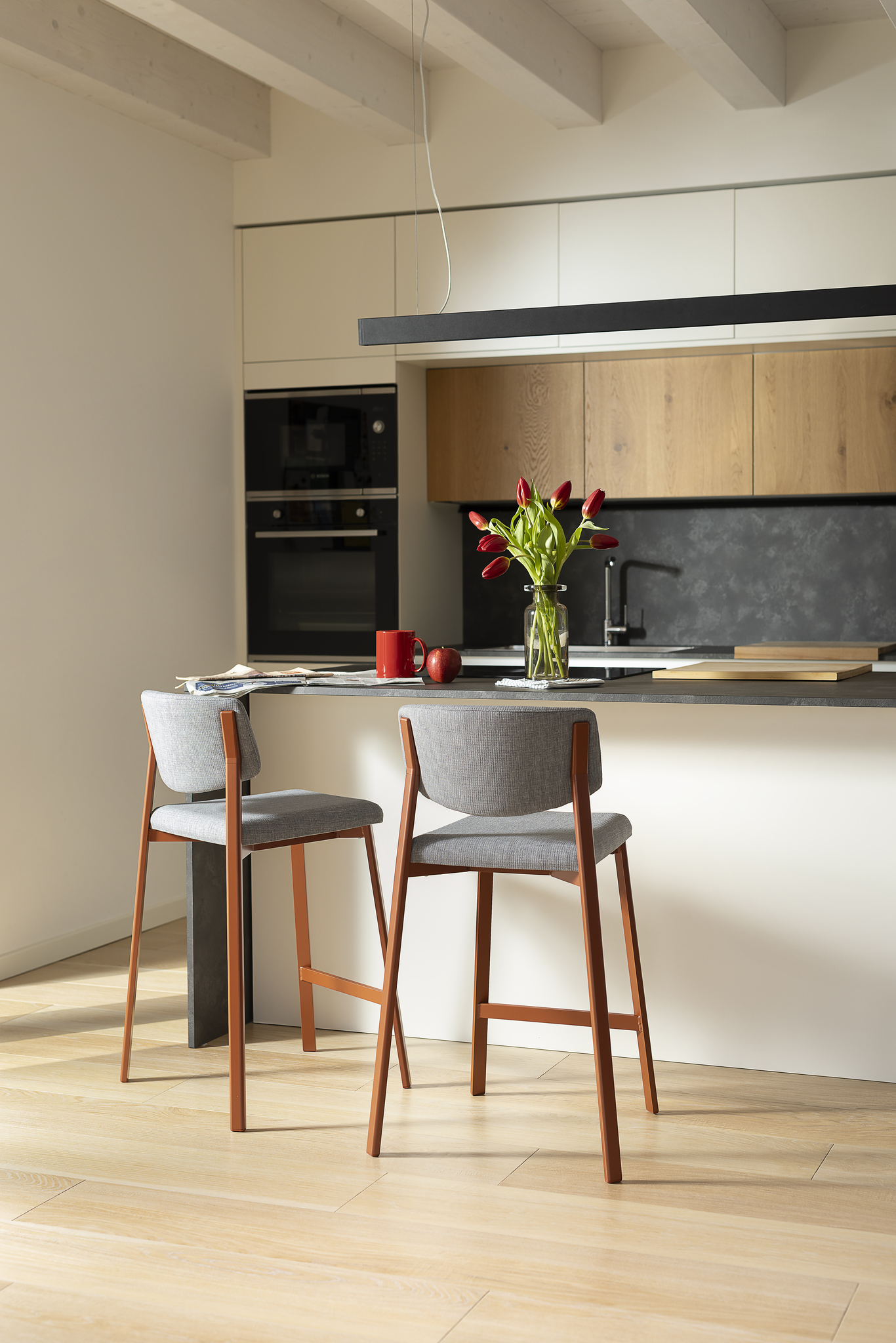 Sur demande, le tabouret peut être commandé avec un dossier en tissu Infinity et une assise dans le tissu de votre choix, ou avec un dossier en cuir Keen et une assise dans le tissu de votre choix.