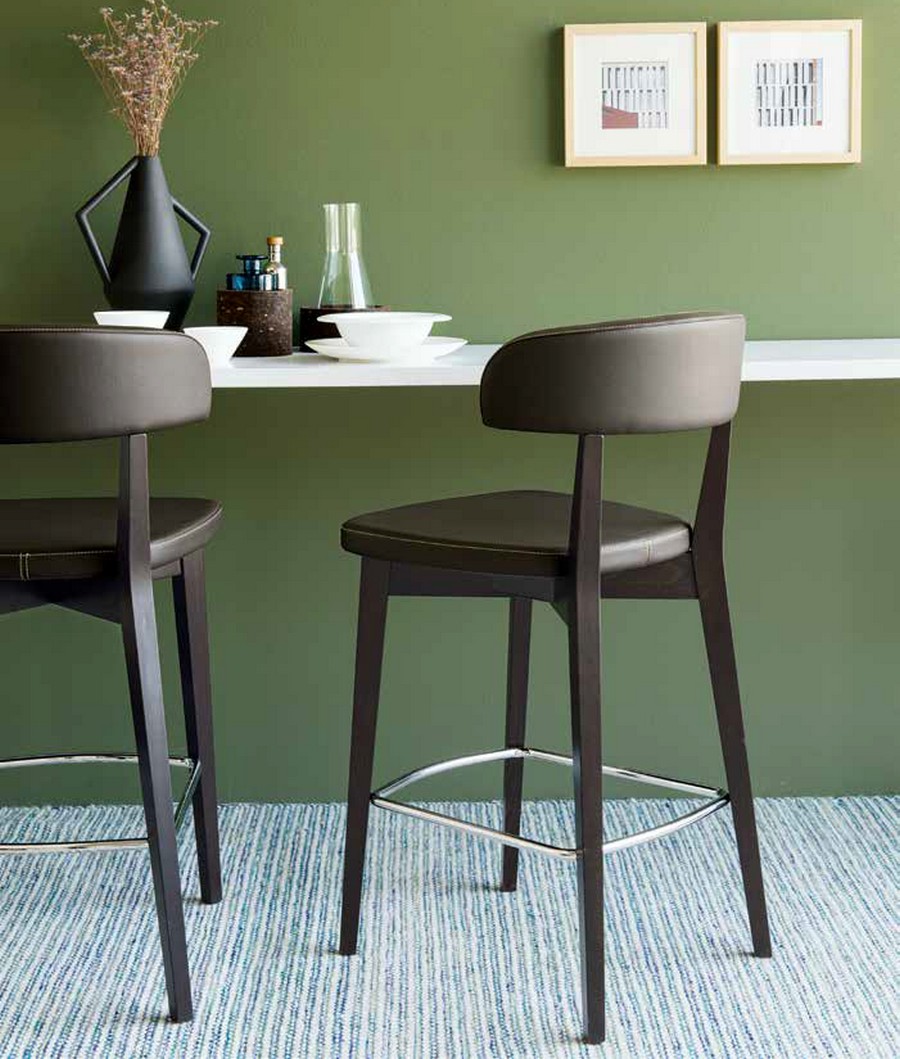 Tabouret Siren CB1542 de Connubia. Design nordique, structure en bois avec repose-pieds en métal chromé, assise large et confortable. Le dossier enveloppant et l'assise large sont tous deux rembourrés. Le revêtement est disponible en différents tissus et couleurs, ainsi que les finitions de la structure en bois, qui permettent une large gamme de combinaisons pour satisfaire tous les besoins.