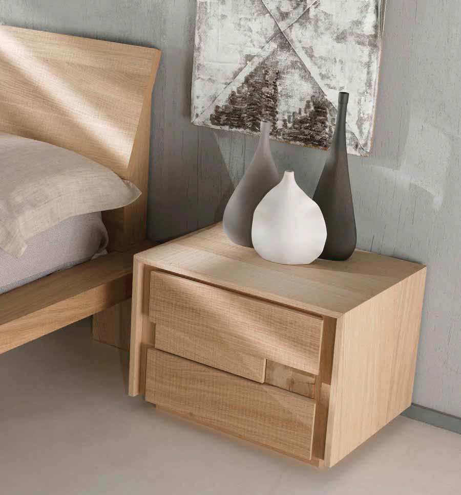 Table de chevet 2 tiroirs en bois de chêne, contemporaine, précieuse et élégante, capable de garantir n'importe quel environnement alliant tradition, chaleur et design. Collection en chêne effet scié. La surface de ces meubles est irrégulière, avec des sillons profonds et perpendiculaires au grain du bois. Ces incisions transversales imitent les signes laissés par les scies lorsqu'elles coupent les troncs et donnent un effet rugueux au meuble, laissant une sensation de bois naturel au toucher.