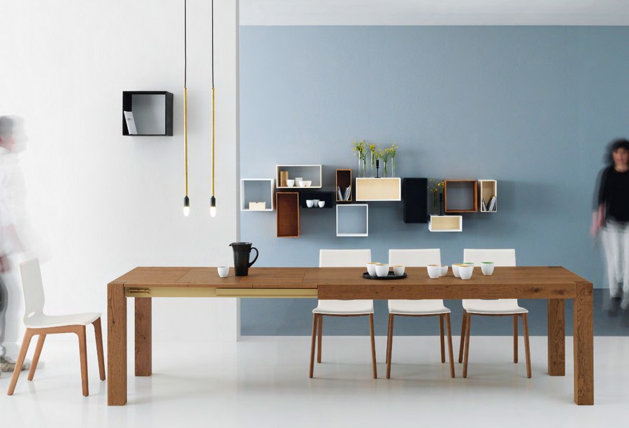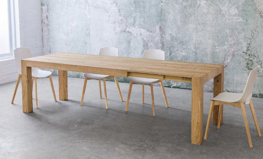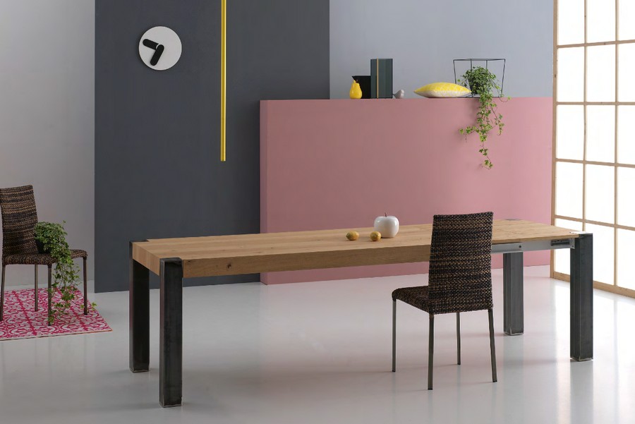 La table extensible Tola de Point possède une structure en bois naturel. Le mécanisme d'ouverture est monté sur un cadre métallique avec guides en aluminium et roulements à billes. Les pieds sont en placage de chêne naturel ou en fer brut. La table Tola est le retour au matériau naturel avec le design et la technique Pointhouse ; la recherche d'une finition agréable au toucher, visiblement délicate et raffinée dans les flammes du bois.