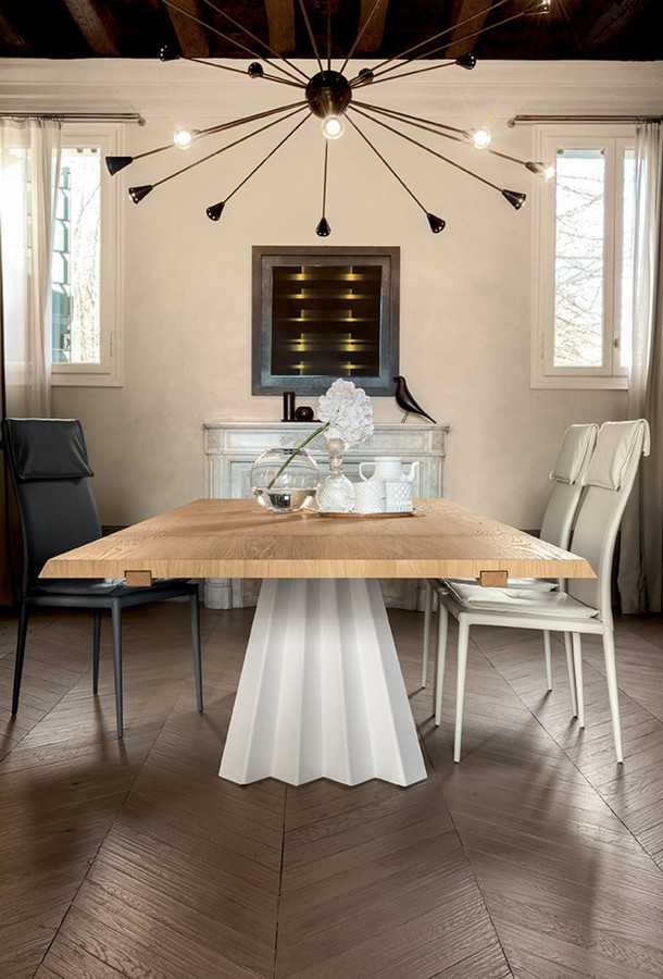Le ventilateur fixe et extensible de Tonin Casa est une table moderne au design audacieux, avec la base qui rappelle la forme d'un ventilateur; la base est en métal façonné, disponible dans les couleurs Blanc mat, Noir mat, Bronze Stone. Le plateau et les extensions sont en verre, en vitrocéramique, en grès cérame ou en bois. Les vitres sont en verre de sécurité trempé à haute résistance aux chocs. Le ventilateur dans la version extensible présente des rails en aluminium avec un choix de finition en aluminium blanc mat, anodisé, gris carbone ou poli. Tout cela devient un chef-d'œuvre du design 100% italien.