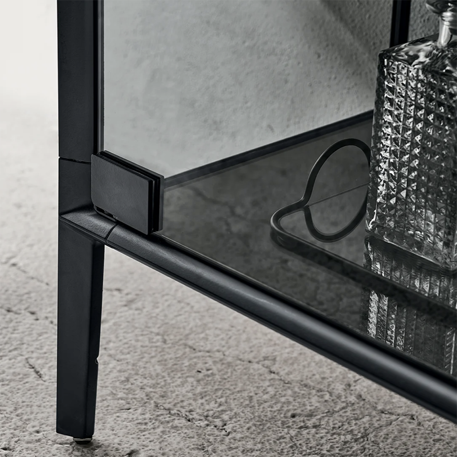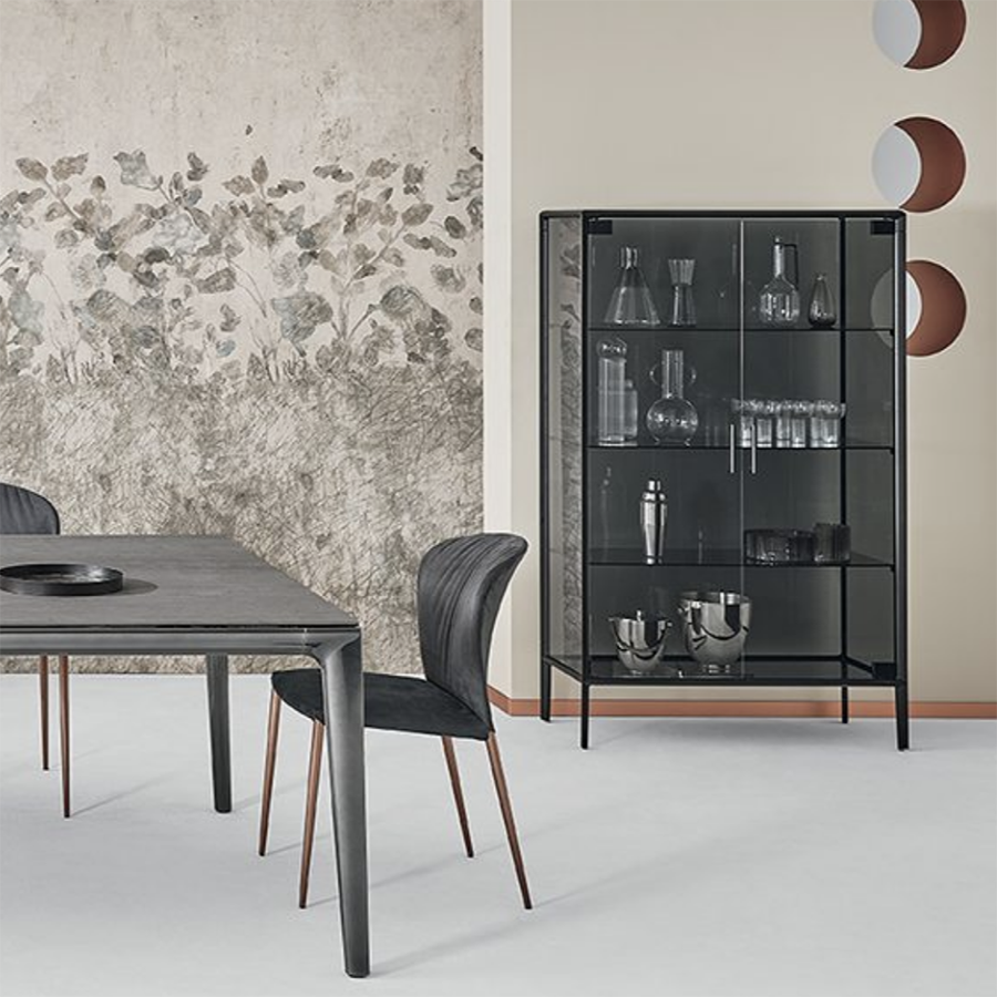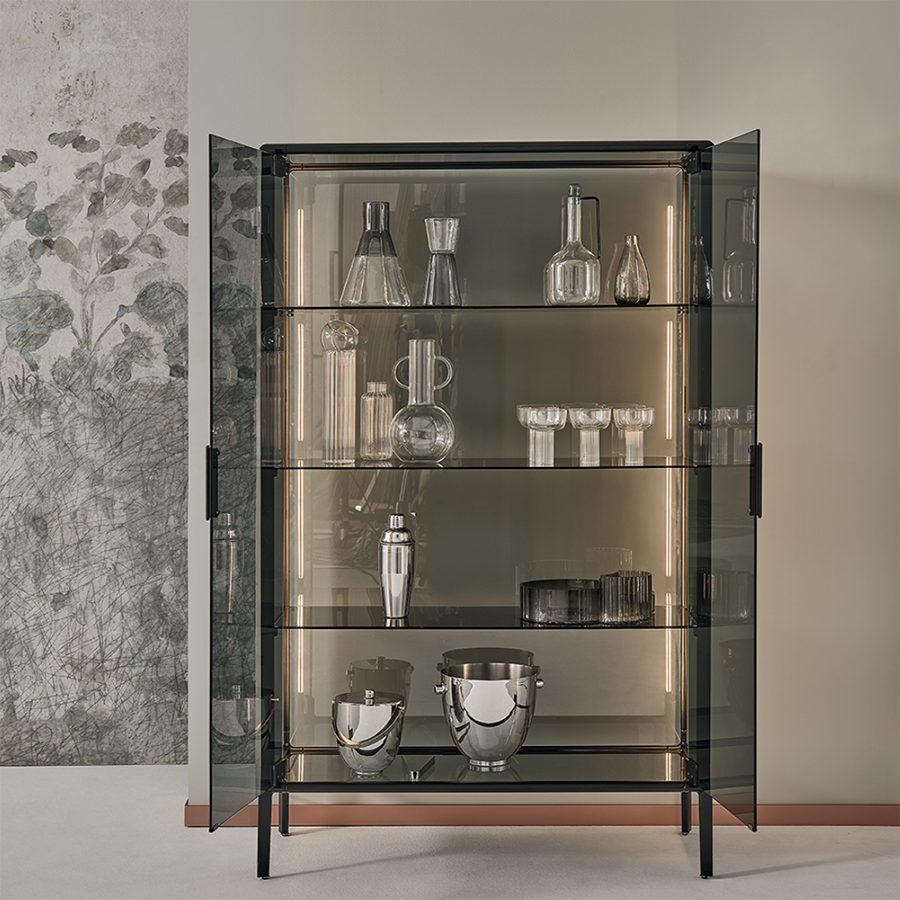 Vitrine avec structure en aluminium composée de deux portes battantes et de 3 étagères internes en verre. Éclairage interne avec piles rechargeables (micro USB). Structure, pieds et poignées en laiton foncé ou aluminium laqué noir mat.