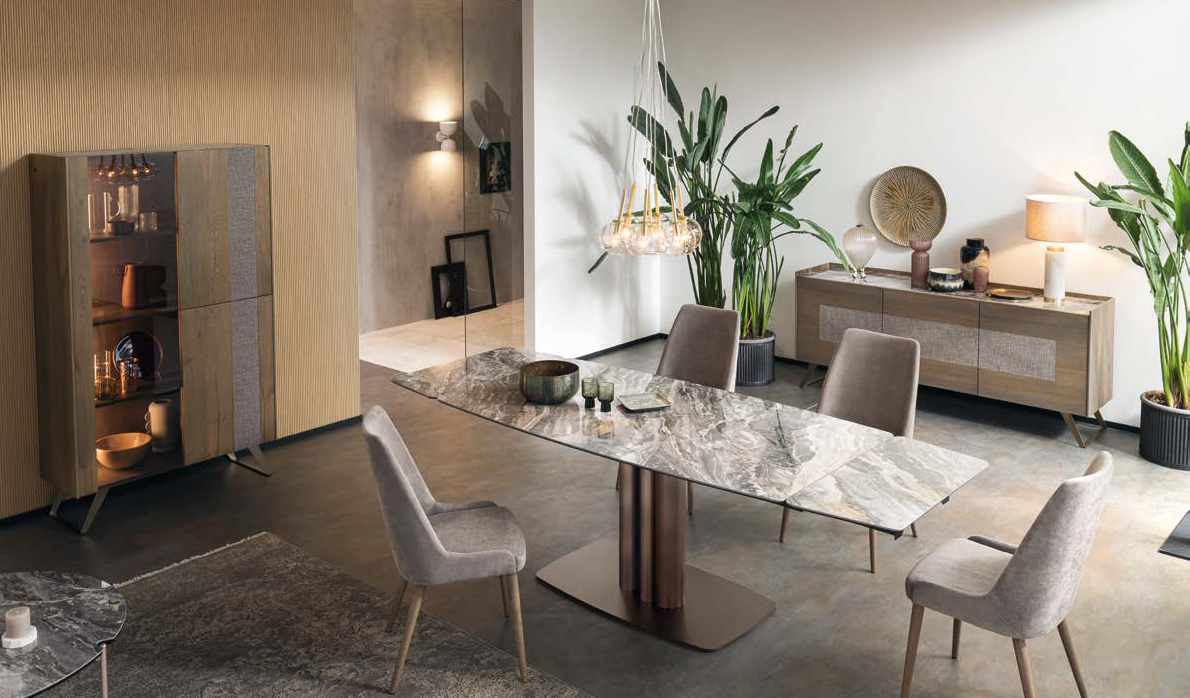 Vitrine Tiffany d'Altacorte avec base en acier disponible en multiples variantes et couleurs, corps et portes dans de nombreuses finitions avec inserts en acier ou texturés (textile sur support acrylique lavable).
