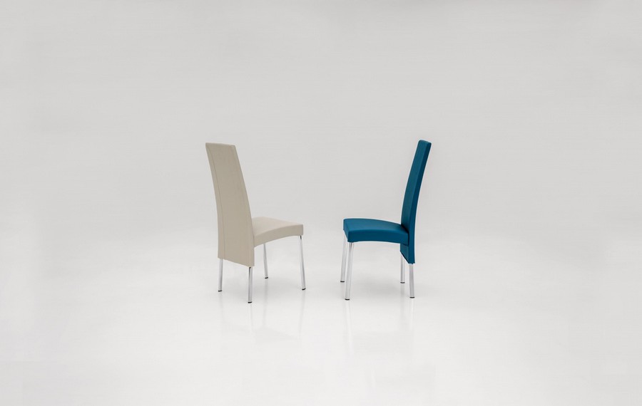 Chaise Charonne de Tonin Casa avec structure en métal chromé, sur laquelle repose l'assise en polyuréthane expansé, revêtue en tissu, cuir, éco-cuir et tissu au design doux et contemporain conçu pour les personnalités les plus exigeantes avec le dossier aux formes particulières et féminines. Un charme contemporain du passé. La force de la matière rejoint la verticalité de Charonne, qui dénote élégance et caractère.