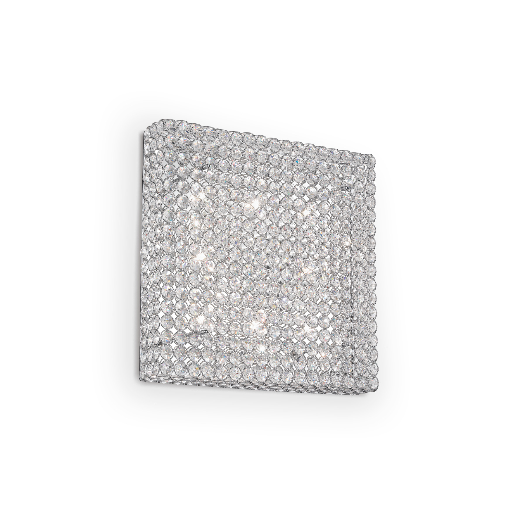 Lampada a soffito/parete Admiral Ideal lux composta da un diffusore quadrato formato da anelli in metallo saldati tra loro ed elementi in cristallo molato incastonati all'interno. Montatura in metallo cromato. Una plafoniera/applique dal design moderno e brillante, perfetta per arredare e illuminare con eleganza. Lampadine incluse.
