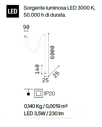 • mm: Ø 25 x P. 25 x H. paralume 140 x H. 6000