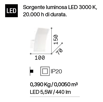 Base in metallo con finitura bianca opaca. Diffusore-dissipatore in lastra d'alluminio da 6 mm di spessore. LED integrati.