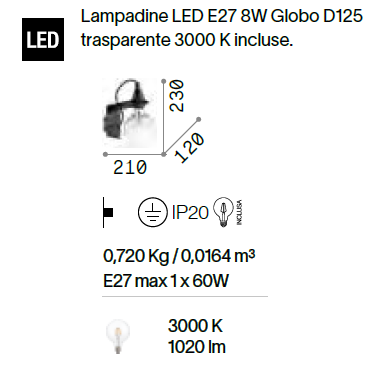 Lampada da parete MINIMAL AP1 bianco di Ideal Lux con montatura in metallo rifinito in smalto colorato. Cavo elettrico con rivestimento in tessuto. Lampadina LED inclusa.