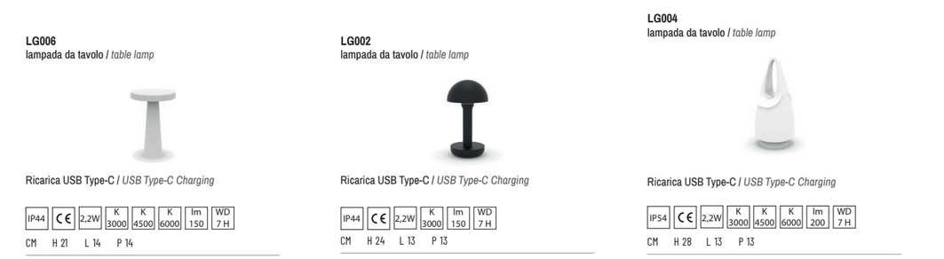 Lampada da tavolo per esterno LG00 di Vermobil, ricaricabile con cavo USB-C. Lampada in plastica e alluminio disponibile in tre varianti.