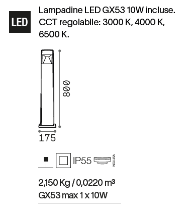 Corpo luce in resina resistente a corrosione, UV, a temperature da -60°a +90° C. Diffusore trasparente anti ingiallimento. Lampadina LED inclusa.