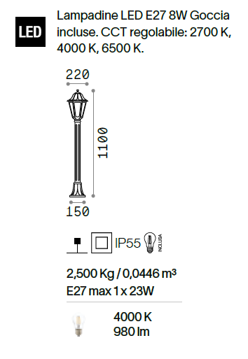 Lampada da terra per esterno DAFNE PT1 nero di Ideal Lux con corpo luce in resina ad alte prestazioni: inattaccabile dalla corrosione, colori stabilizzati da trattamento U.V., resistente a sbalzi termici da -60° C a + 90° C. Diffusore in metacrilato antingiallimento. Lampadina LED inclusa.