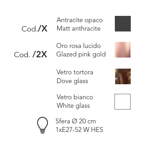 Lampada Geo a sospensione in metallo verniciato antracite opaco o oro rosa lucido con sfera coprilampada in vetro di Murano colore tortora oppure bianco.