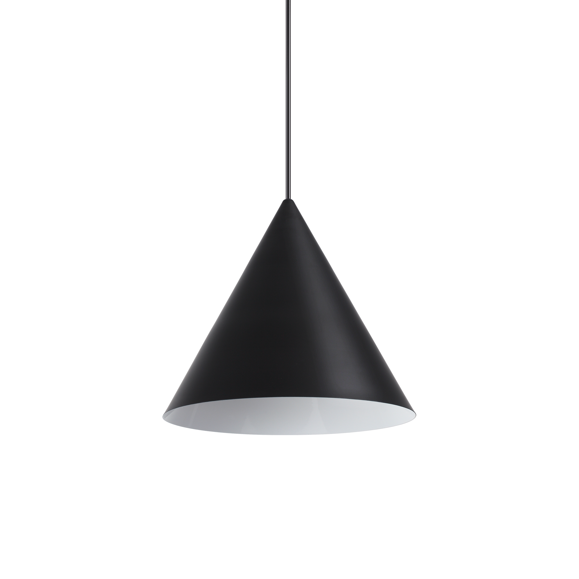 A-Line lampadario a sospensione con rosone in metallo verniciato a polveri. Diffusore in metallo verniciato nero opaco con interno bianco. Cavo rivestito in tessuto. Lampadina esclusa.