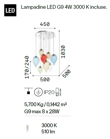 Lampadario a sospensione Clown sp8 color di Ideal Lux con montatura in metallo con diffusori in vetro soffiato e modellato a mano. Montatura in cromo e vetri multicolor. Lampadine LED incluse.