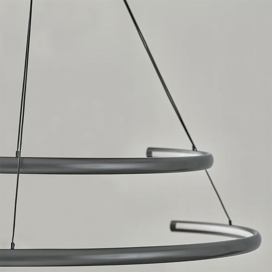 Lampada a sospensione con rosone verniciato nero e struttura in acciaio laccato. Previsto telecomando touch per dimmer – portata 30 m – e ricevitore optional. Per tutti i modelli l'altezza massima è di 380 cm.