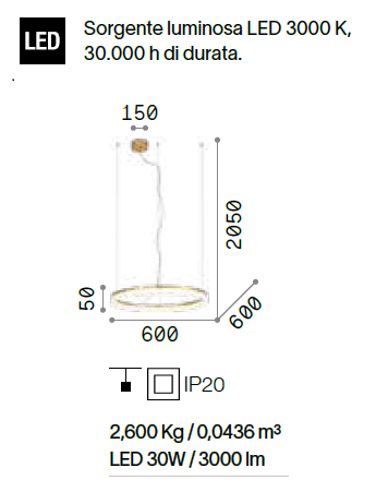 mm: Ø 600 x H paralume 50 x H. totale 2050