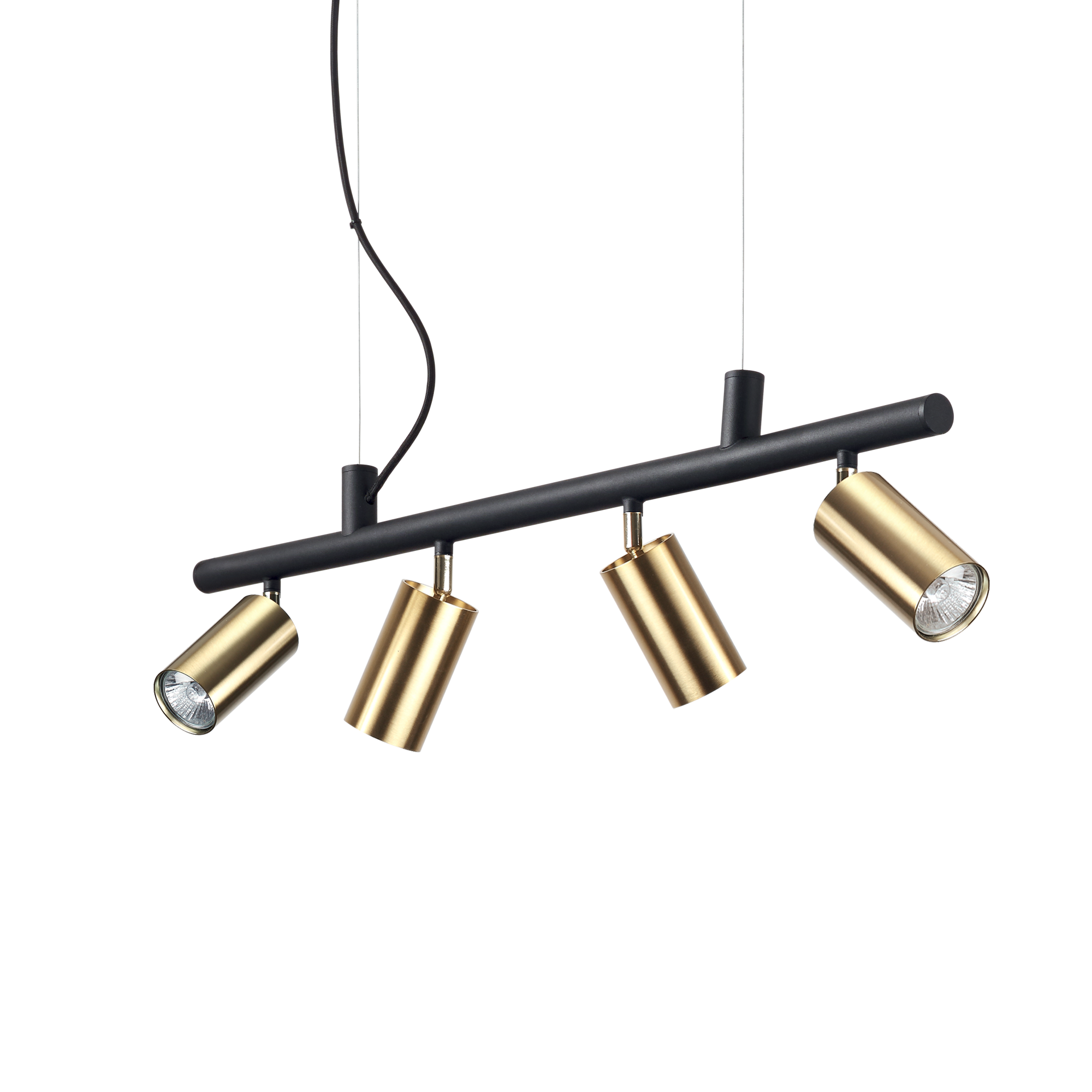 Lampadario a sospensione DYNAMITE SP4 ottone satinato di Ideal Lux con montatura in metallo rifinito con vernice a polveri o placcato e spazzolato. Diffusori orientabili. Cavo elettrico in tessuto. Sospensioni con incluso kit per installazione anche a plafone. Lampadine incluse.