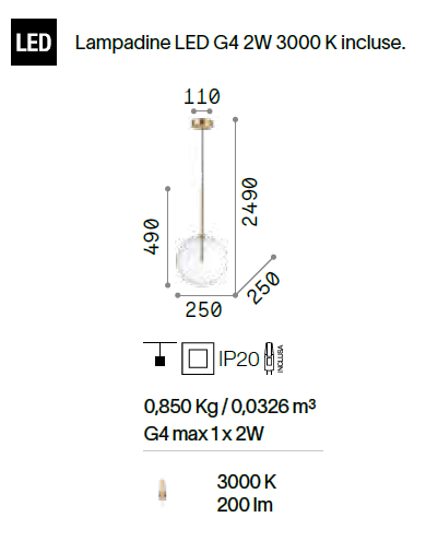 mm: Ø 250 x H. paralume 490 x H. 2490